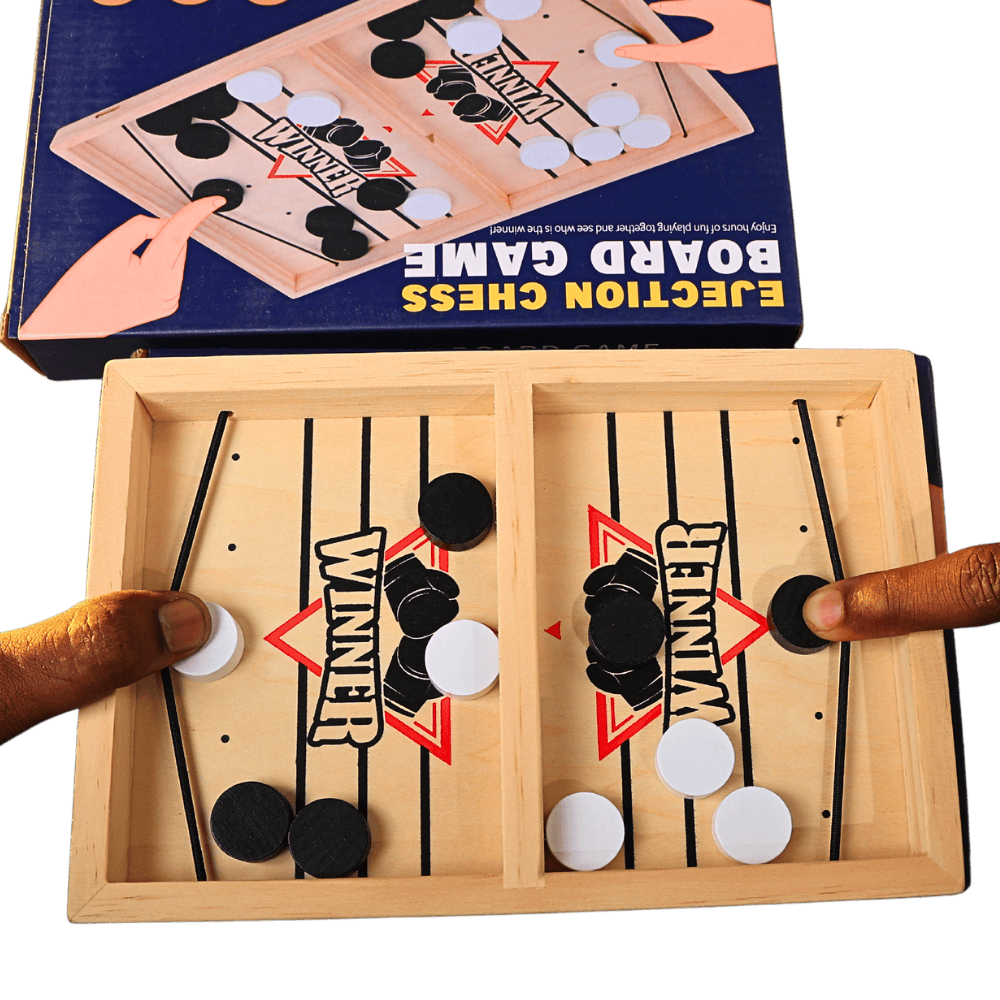 A fast-paced ejection chess style board game that combines strategy and quick reflexes for children and family fun.