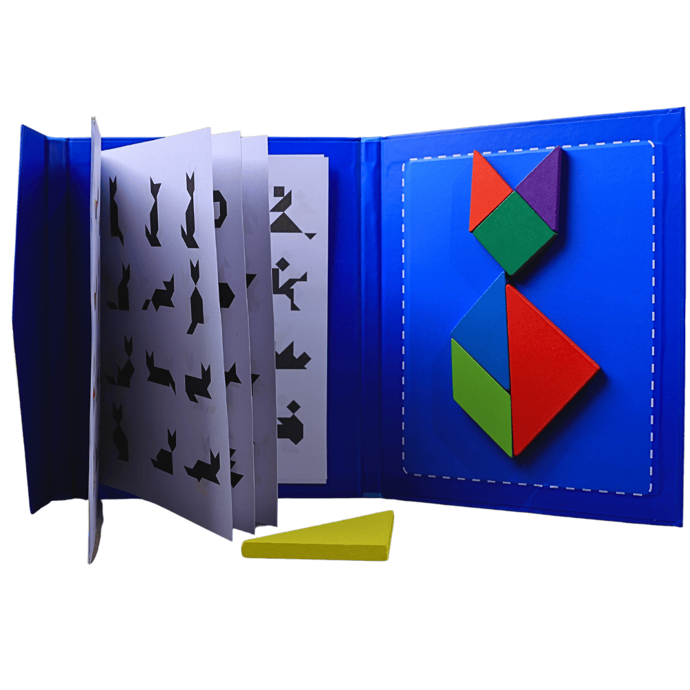 A magnetic tangram puzzle book that builds spatial thinking, creativity, and focus through guided and free form, screen free play.