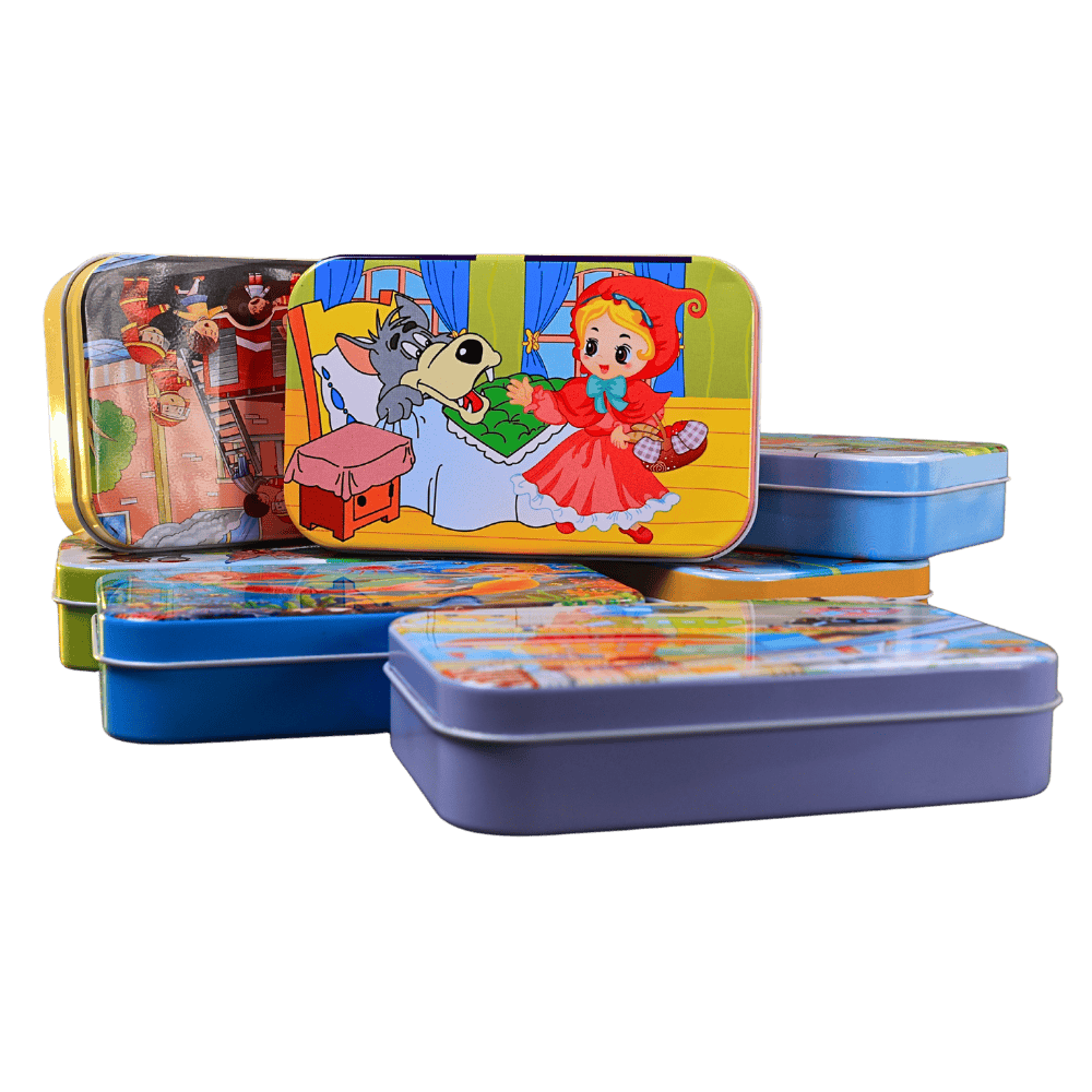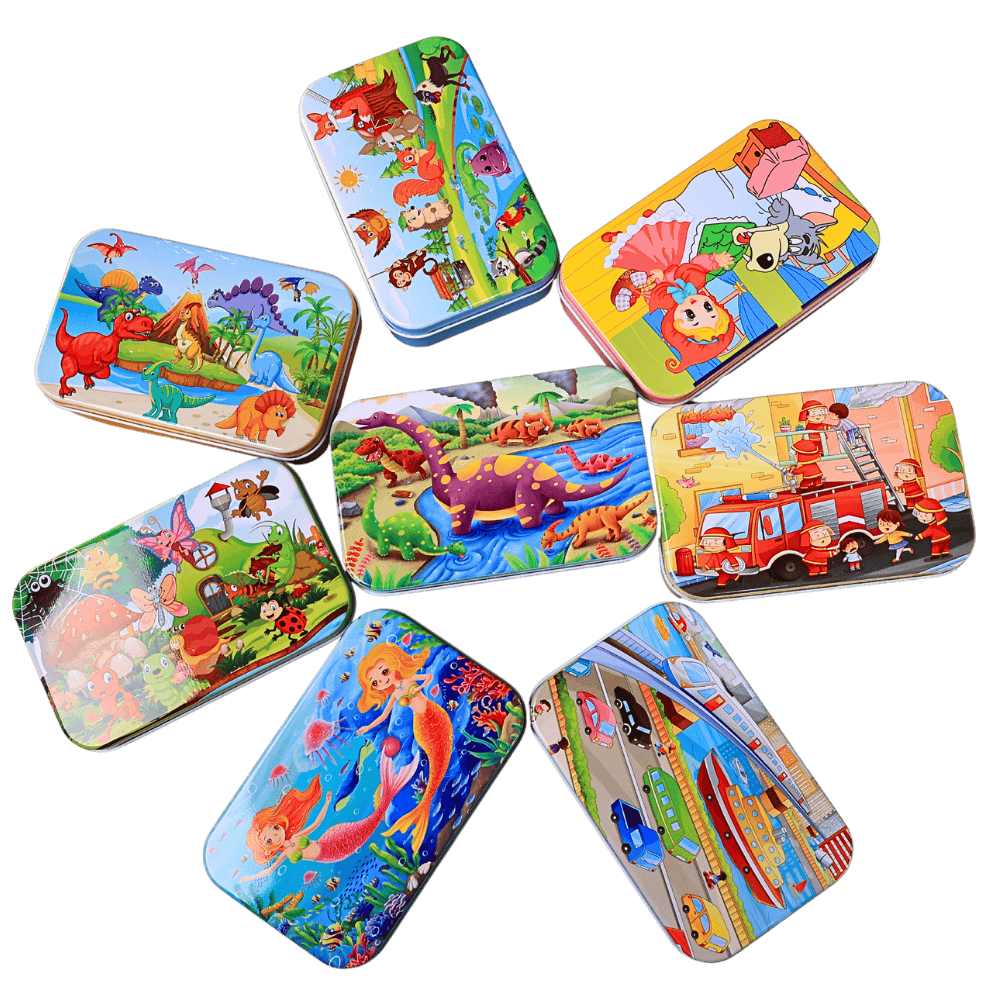 A compact wooden jigsaw puzzle packed in a sturdy tin box that keeps kids entertained while building problem solving and visual skills.